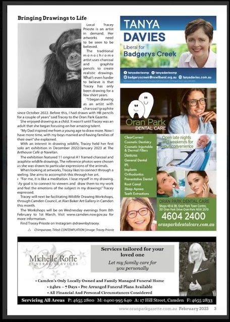 Her wild cat artworks received personal recognition in a handwritten letter from Sir David Attenborough, acknowledging the emotional depth of her animal portrayals. She has also been awarded Highly Commended at the Camden Art Prize and by the Royal Agricultural Society of NSW (RAS NSW).